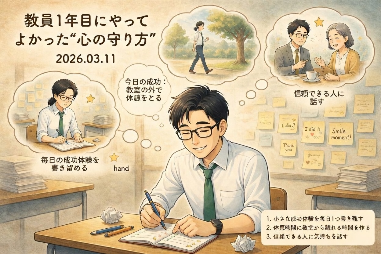 どれも特別なことではありません。ほんの小さな習慣ですが、続けることで、自分の心を守りながら教員生活を少しずつ楽しめるようになります。