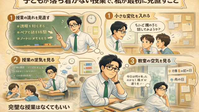 -授業を始めてみると、なんとなく教室がざわついている日があります。特別に騒いでいるわけではないけれど、落ち着かない空気。話し声が少し残ったり、集中が続かなかったり。そんな日は、どれだけ説明しても子どもたちの意識がそろわず、授業が進みにくく感じることがあります。教員になったばかりの頃は、そういうときに「もっと静かに」「集中して」と注意することが多かったように思います。でも、それで教室の空気が落ち着くことはあまりありませんでした。今は、クラスがざわつく日には、まず自分のやり方を少し変えてみるようにしています。話す時間を短くするざわつく教室で長く説明を続けても、なかなか集中は戻ってきません。そんなと...